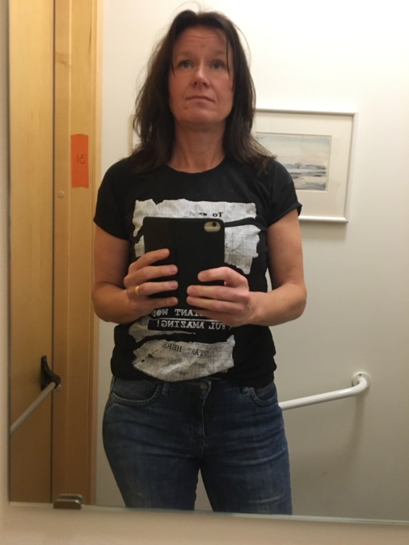 Hon satte ett kryss med en svart penna där de satt. Och hon ville skicka mig på röntgen. Ut i väntrummet och vänta på remiss dit. Efter en stund blev jag återigen uppropad. In i en liten omklädningshytt 1*1 meter.
