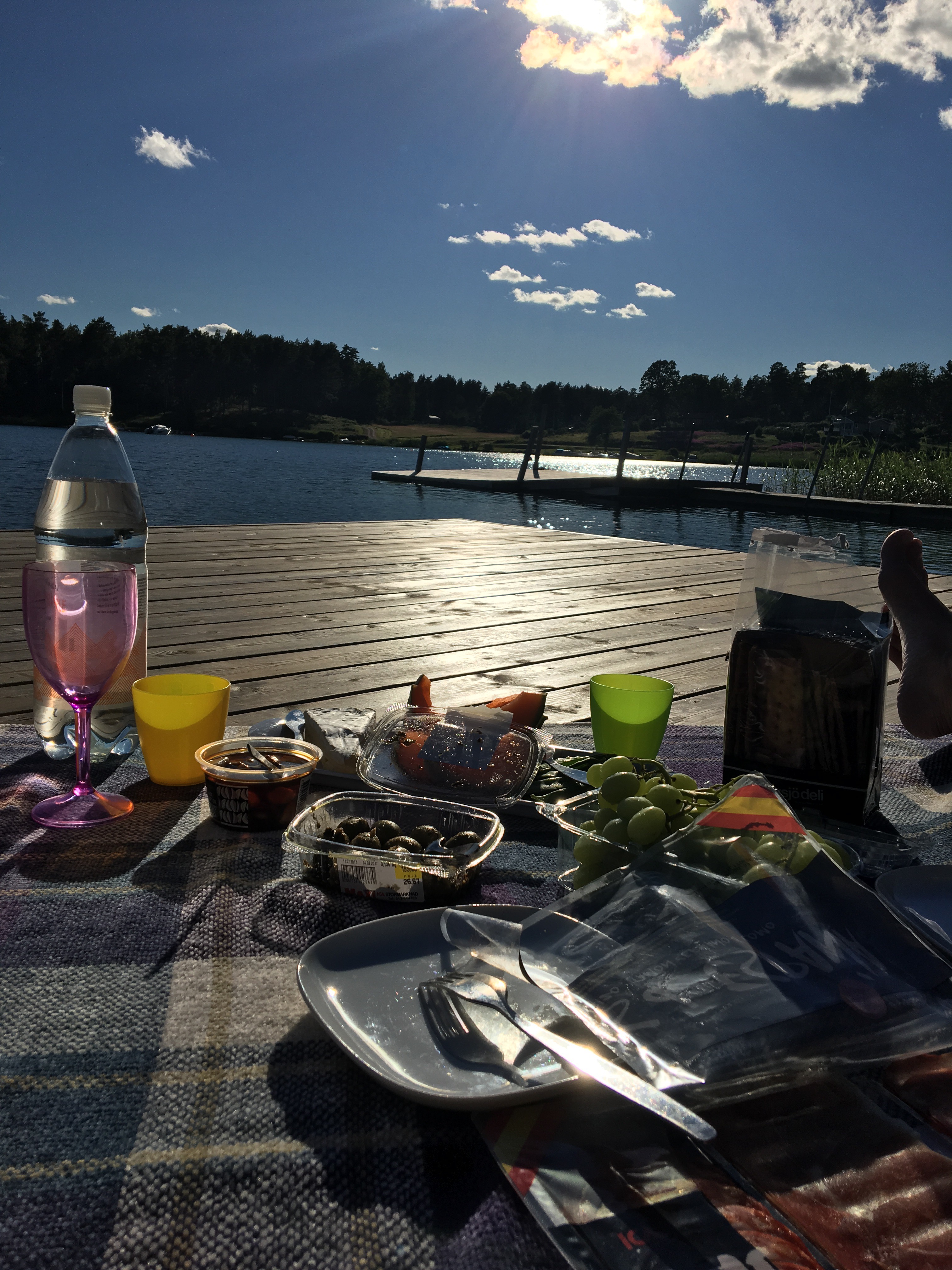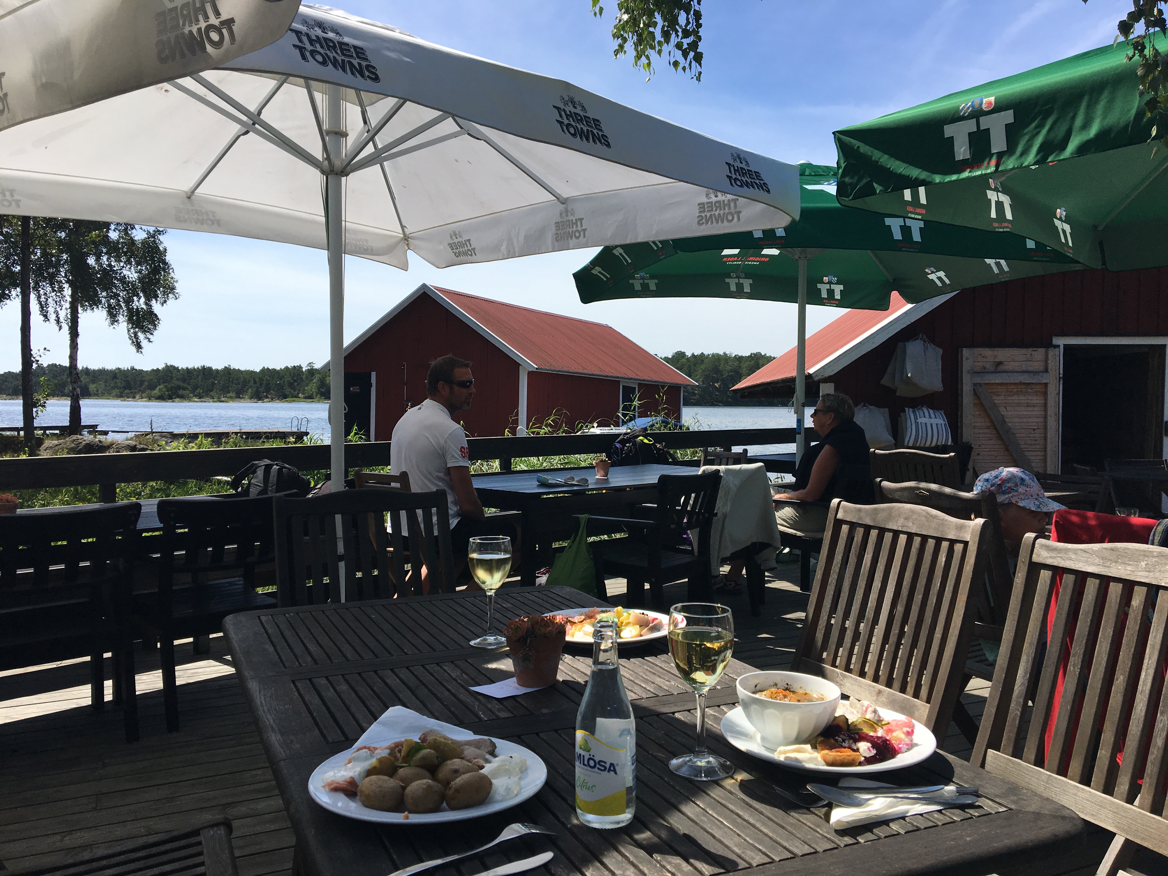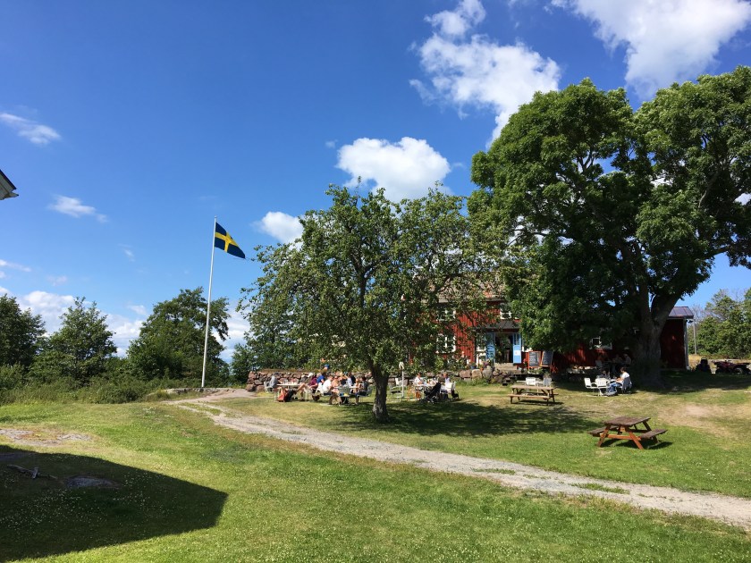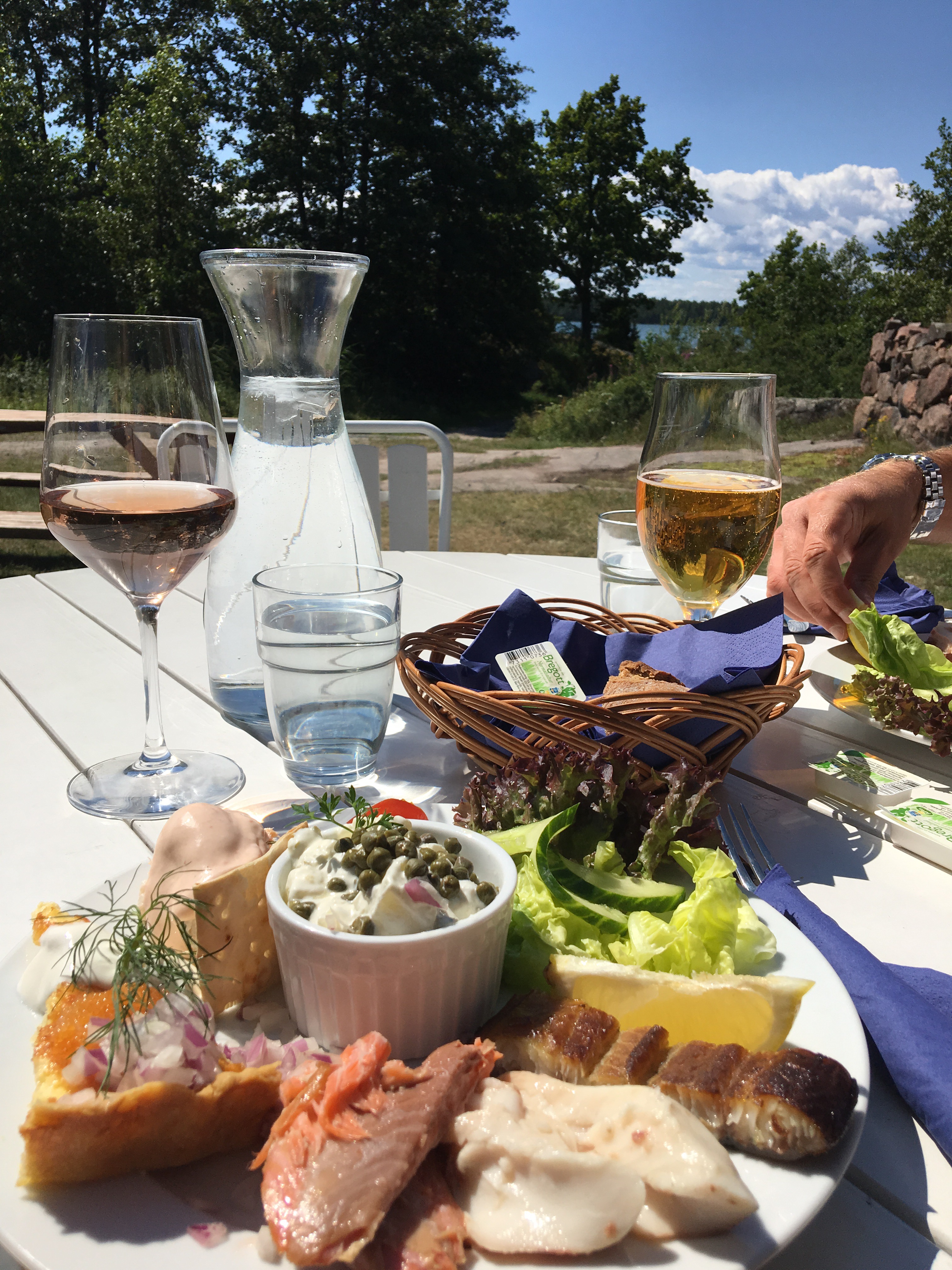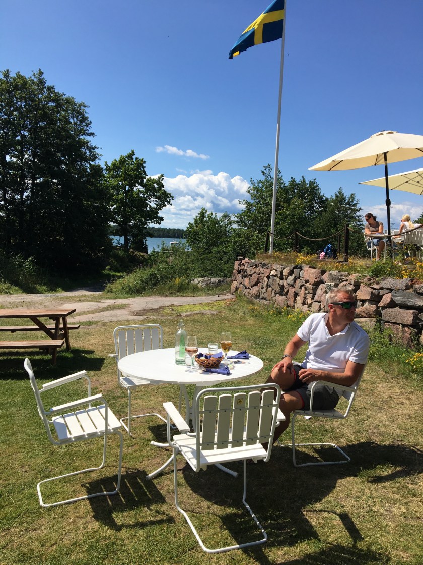 En utsökt liten servering låg plötsligt framför våra fötter. Med den svenska flaggan vajandes i den blåa himlen. En meny med skärgårdsinspiration. Vi tog självklart varsin skärgårdstallrik.