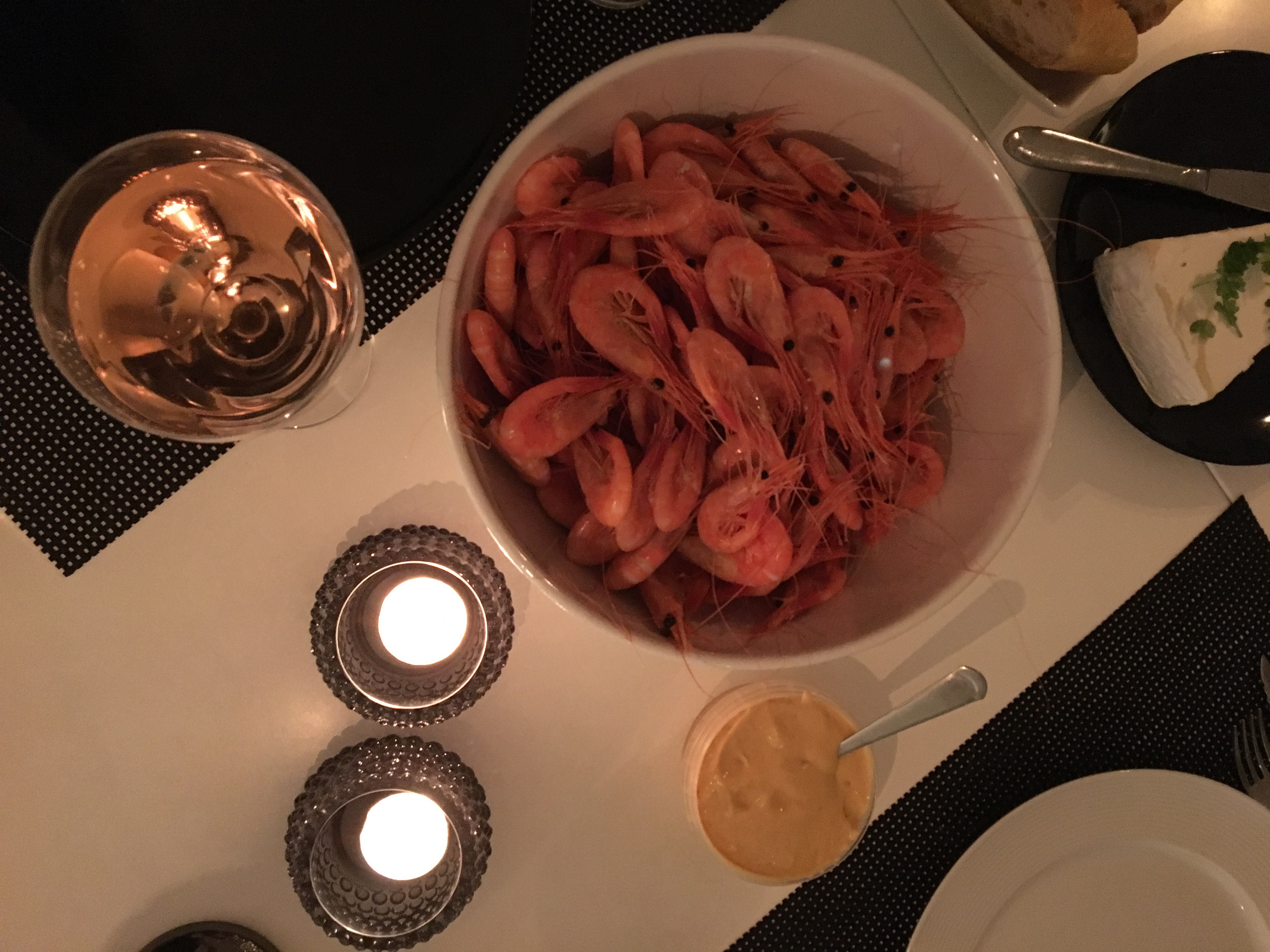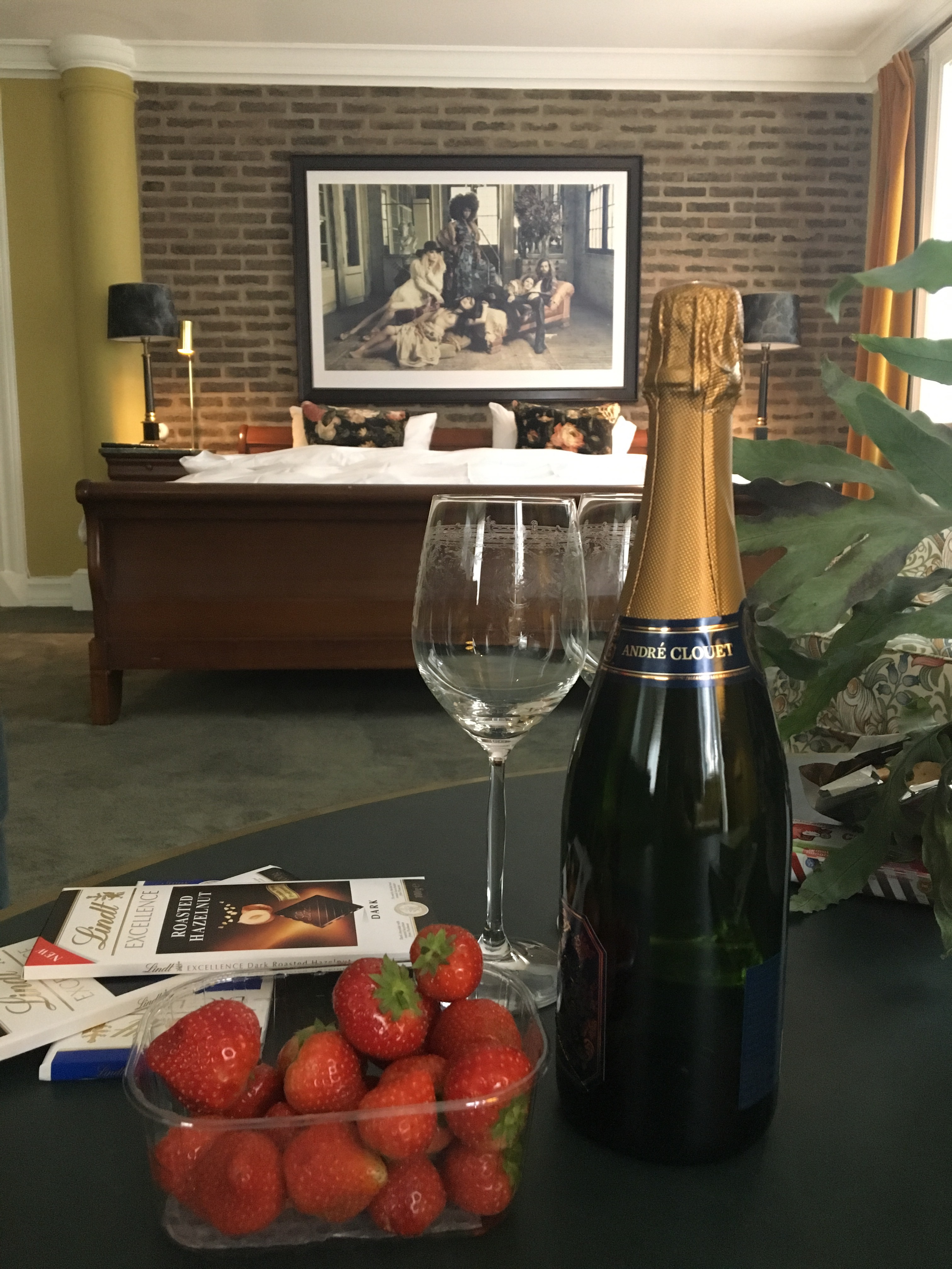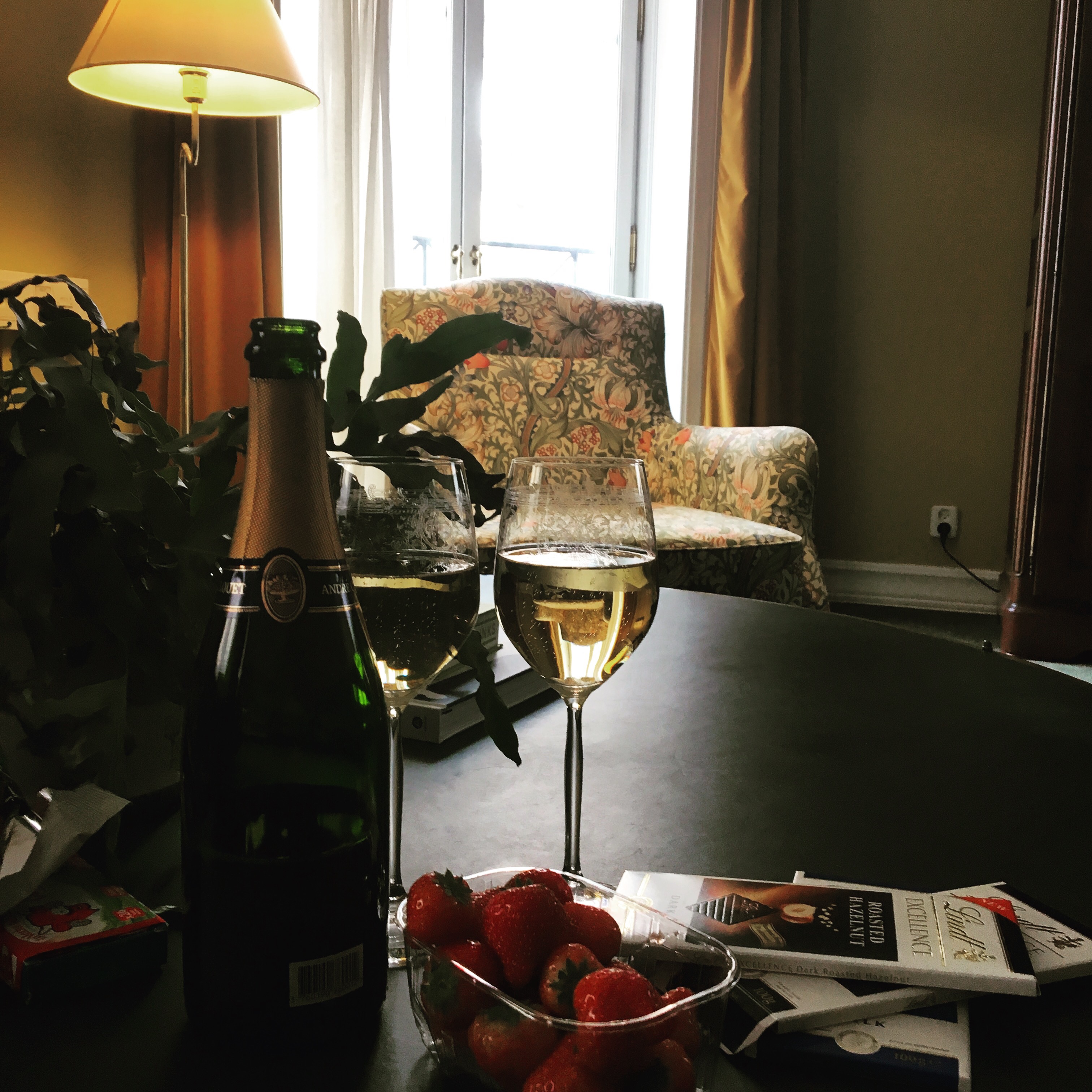Sjävklart var det dags för lite bubbel på rummet. Med jordgubbar, ost och kex och lite choklad. En behöver allt unna sig.