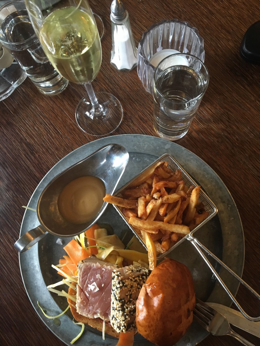 Dörrarna på hotel Savoy blåstes upp så vi knallade sonika in. När våra män och söner var i Manchester och kollade på fotboll så ägnade vi oss åt stt dricka bubbel helt enkelt. Och åt en helt ljuvlig lunch med grillad tonfisk.