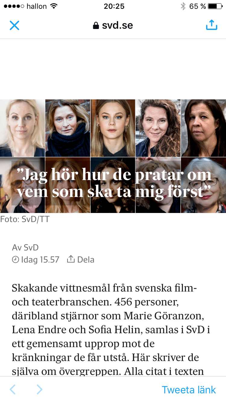 Överallt plötsligt. Många är kvinnorna som har blivit utsatta för någon form av sexuellt övergrepp. Eller nån form av sexuella trakasserier. Jag baxnar av alla dessa olika berättelser. Samtidigt som jag inte alls är är förvånad. Inte ett jäkla dugg faktiskt.