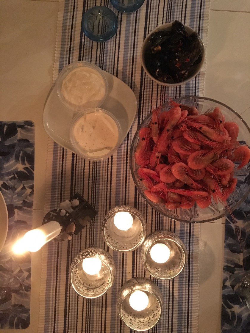 800 gram Nordhavsräkor samt 12 chilimarinerade musslor blev det i påsen med till kusten. Och två sorters såser. Husets egna romsås och deras fantastiskt goda aioli.