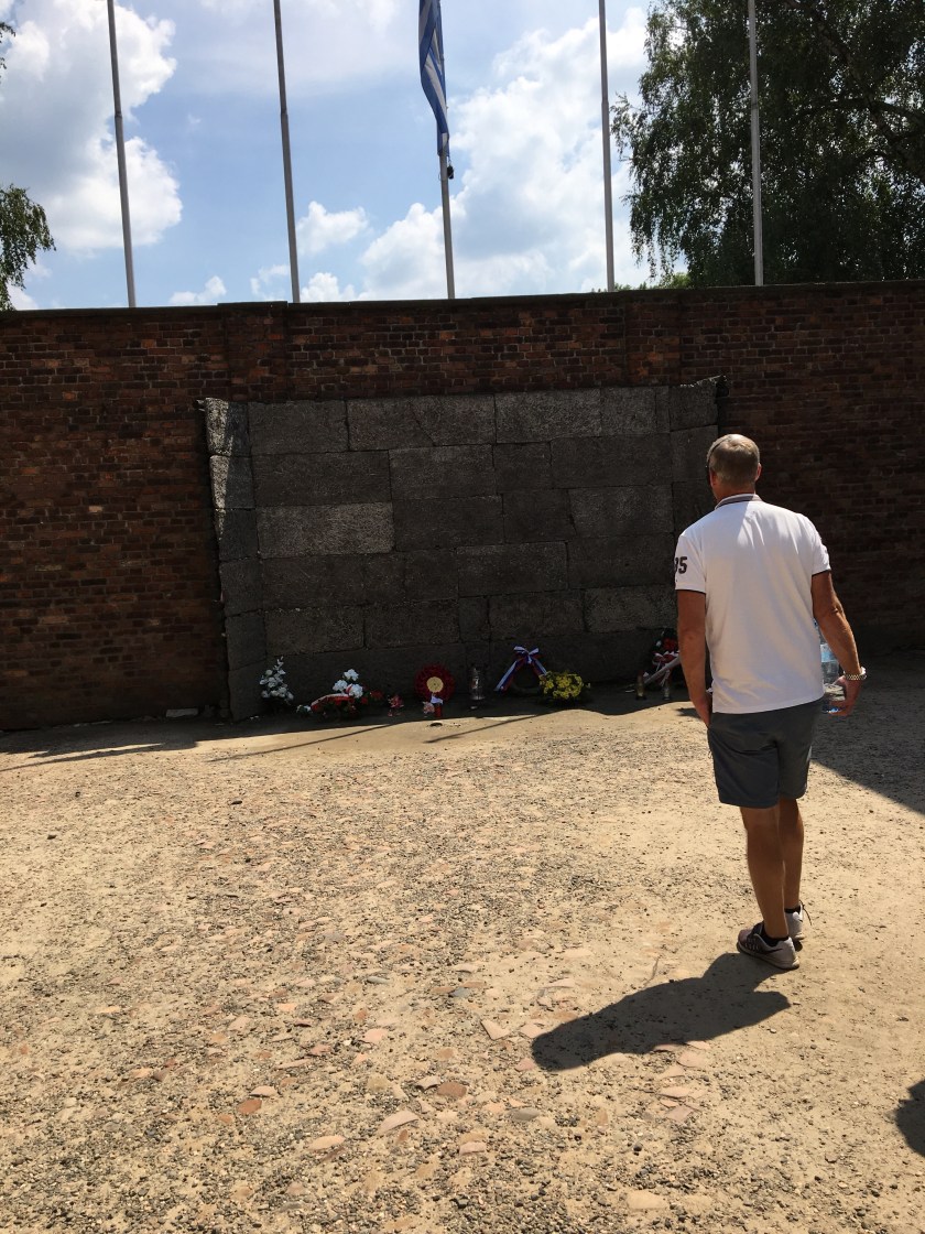 Utanför Block 11, Dödens hus. Där avrättningar till slut skedde på löpande band. Bl.a. vid den här väggen där de sköts. Eller de olika Dödscellerna. Eller Mörkerrummet. Eller tex stå fyra människor tätt, tätt, tätt tills nån stupar av ren utmattning. Blocken som kallades sjukhus inga sjukhus. Där fick man ingen behandling så man blev bättre. Där dog man ännu fortare bara. Så ingen ville dit. Ingen sökte vård.