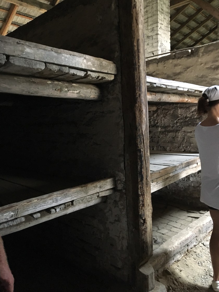 Sovplatser. Byggda för fyrapersoner på varje brits. Men som i verkligheten innehöll upp till 6-7 personer. De svagaste längst ner. Som inte orkade klättra upp. De starkaste där uppe. Där låg de i löss, skabb, diarrér och spyor, värme och kyla. På vintern ca fem grader kallt i husen pga helt oisolerade och 10 cm öppen spalt mellan tak o vägg högst upp. Tänk er doften här inne. Och så dödsångesten på det. Dödsångesten som varenda liten individ gick omkring med hela tiden. Den kunde man nog också känna doften av. Kroppar som lider. Ögon som har slutat glittra för länge sen. Hjärtan som brast redan på perrongen. På toaletten fick man gå två gånger om dagen. Om man hade tur. På dessa grusgångar gick vi. På samma gångar som spred sån skräck för 70 år sedan. På samma gångar som gav ca 1,5 miljoner människor ett de som inte går att föreställa sig. Människor av kött och blod. Precis som du och jag.