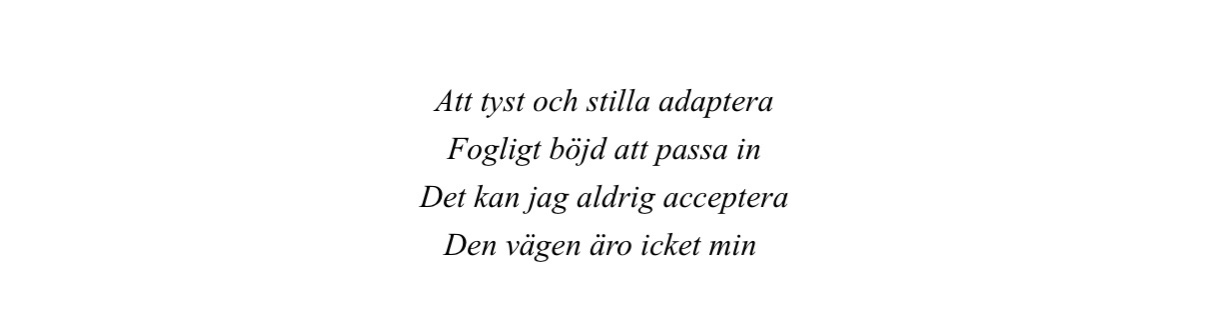Följande stycken är ytterligare ett exempel på hur chanslös man som ensam individ är mot den enorma, resursslukande byråkratin i Sverige. Hur fyrkantigt allting är, hur lite man tillåts vara annorlunda och hur man som egentänkande individ stryps till döds av våra verklighetsfrånvända paragrafryttare till skolpolitiker på daglig basis. De som inte sticker ut lyckas bäst, det är Skolverkets ambition med systemet de har, och de lyckas uppnå det målet väldigt väl. Alla som på något vis har andra åsikter, värdegrunder, egenskaper, talanger, svagheter eller kvaliteter, ska långsamt reduceras och pressas samman tills det som gör dem unika har kramats ut. Kvar finns ett skal, innehållandes ingenting, som sedan går att forma till en påverkbar medborgare utan ryggrad eller egen vilja. Världens bästa musikband, Raubtier, med frontman Pär Hulkoff i spetsen, har en låttext enligt följande: