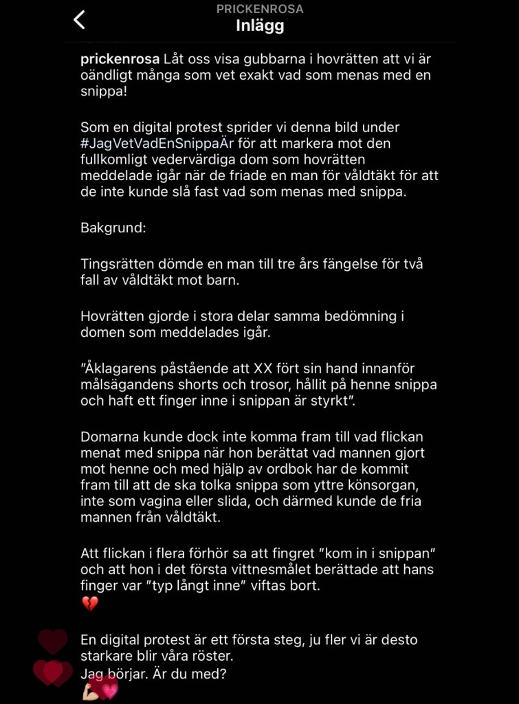 Jag skäms över hur det över huvud taget kan få gå till på det här sättet i Sverige 2023. Jag skäms över hur fyra gamla gubbar sitter i sin rättssal och har en 10 årig flickas hela framtid i sina händer, och de bara kastar bort den. Bara sådär. För att de inte vet vad en snippa är!